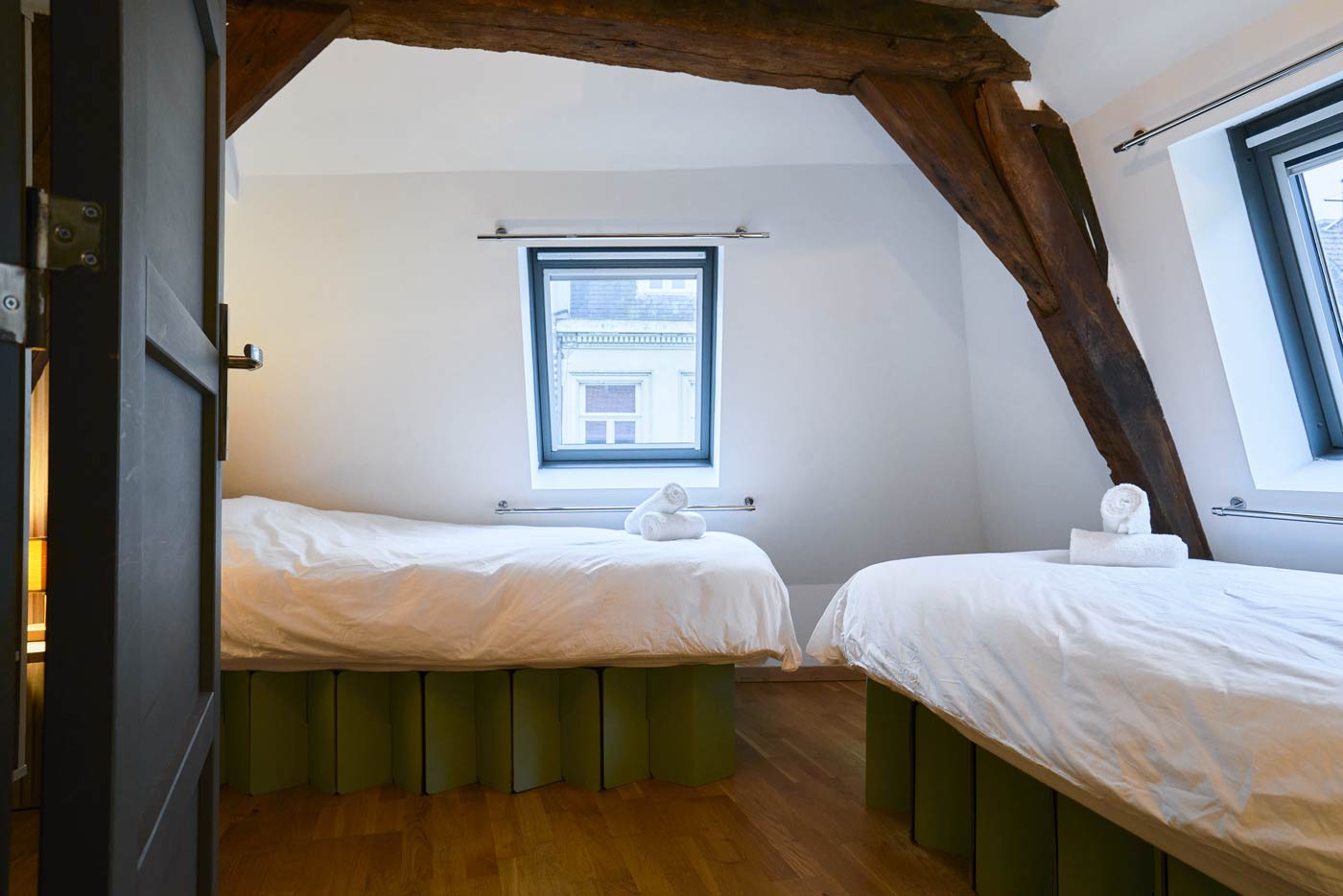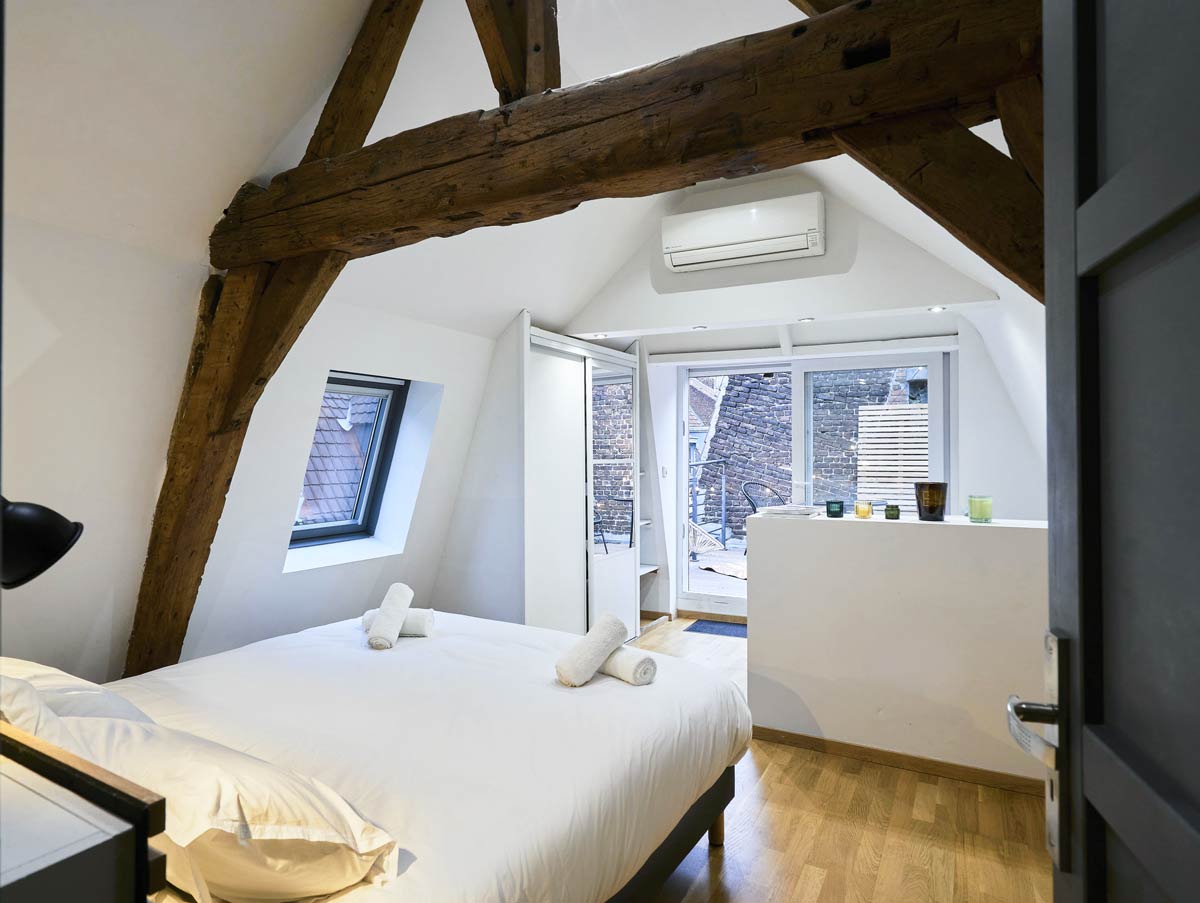 À l’angle de la rue sous la charpente aux bois séculaires, la deuxième chambre offre un couchage pour deux personnes. Elle est très claire et ses fenêtres donnent sur les trésors architecturaux des XVIIe et XVIIIe siècles de la rue Royale qui possède les immeubles parmi les plus beaux du Vieux-Lille.