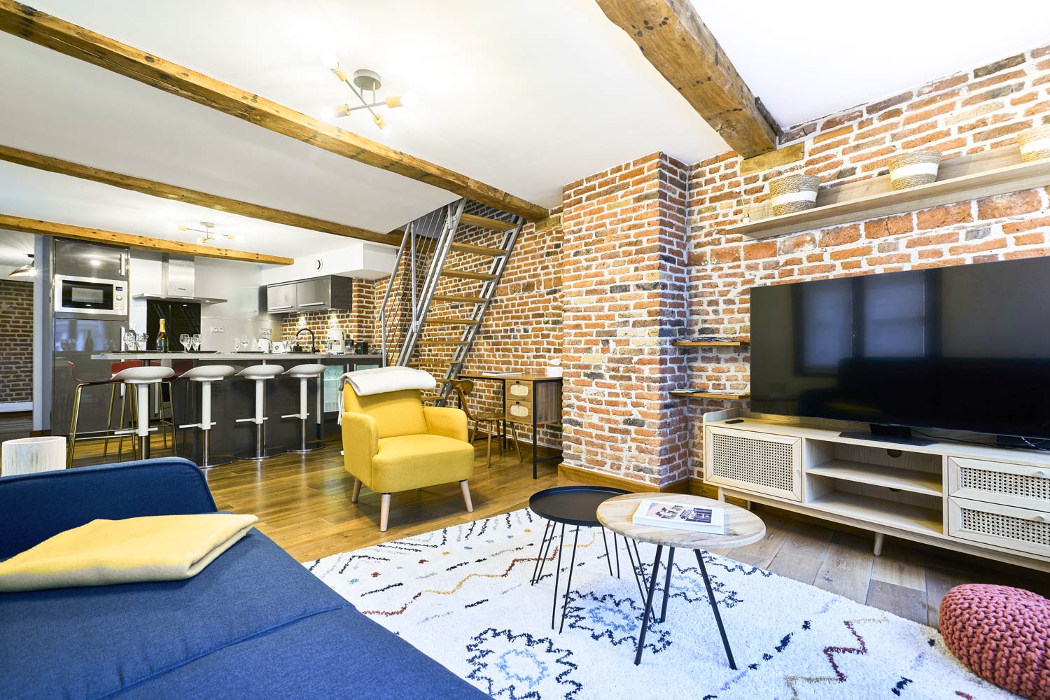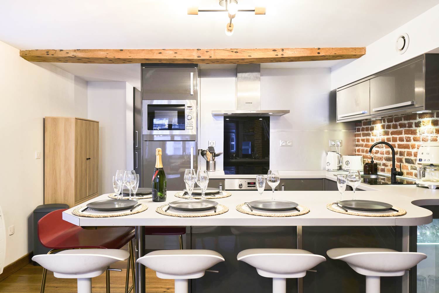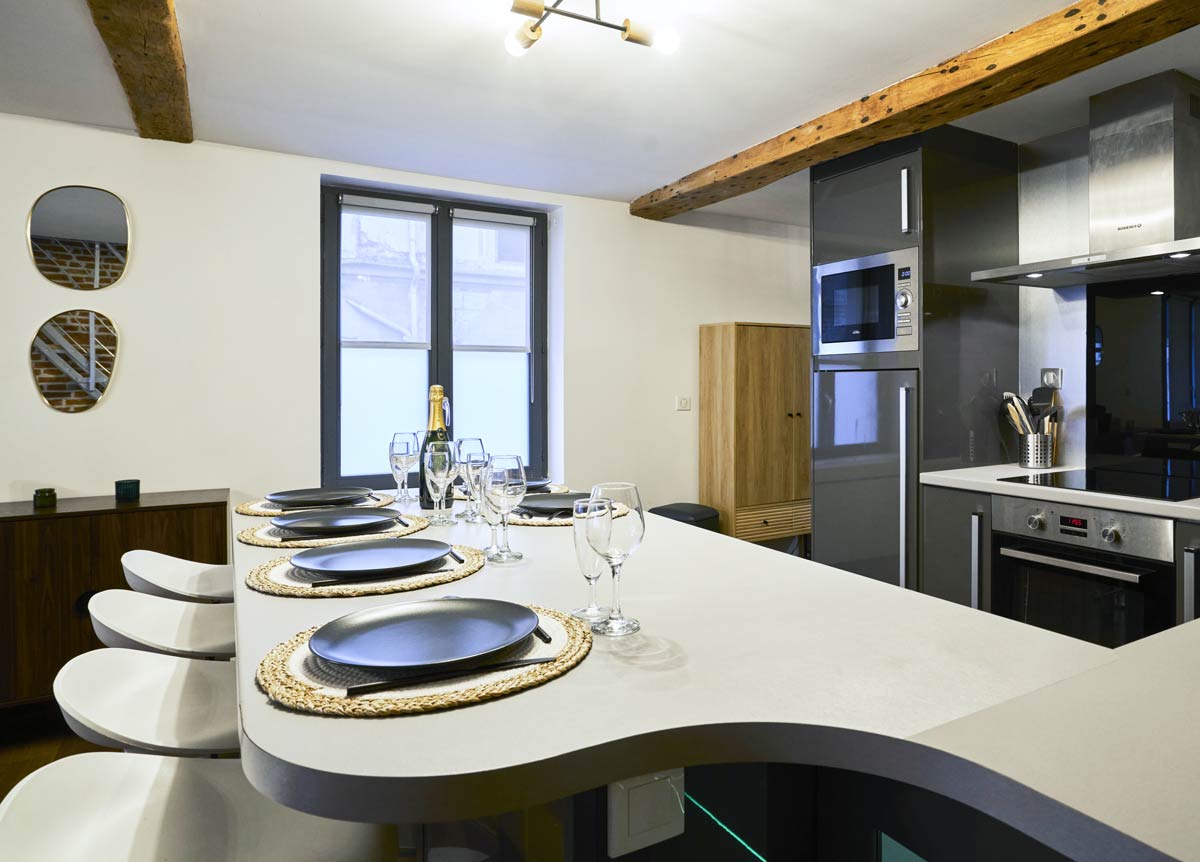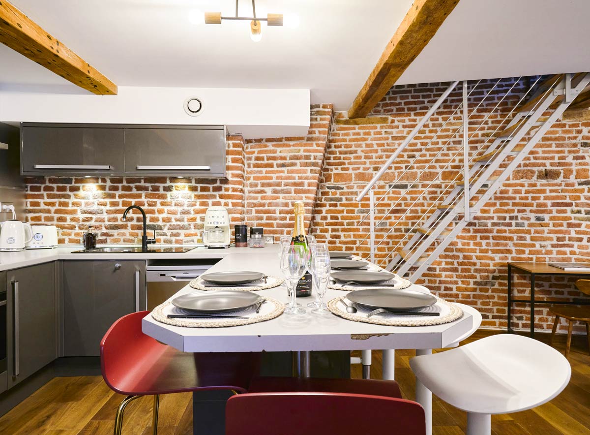 Vous apprécierez la cuisine moderne et entièrement équipée de la Suite Royale du Vieux-Lille, parfaite pour préparer des repas gourmands. Avec des équipements de haute qualité, elle vous permet de cuisiner comme à la maison tout en profitant de votre séjour. Elle allie le charme des maisons lilloise avec ses murs en briques anciennes apparente et une décoration chic et moderne.