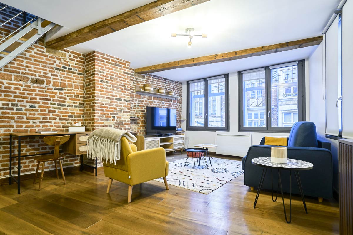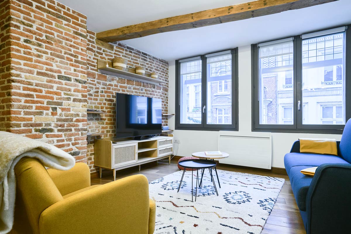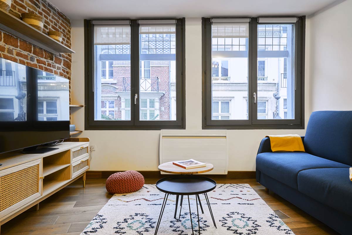 Le séjour se compose d’une grande salle au premier étage ouvert sur la cuisine et largement éclairé par trois fenêtres rehaussées de petits vitraux carrés translucides. Il propose un canapé convertible capable d’accueillir deux personnes et un large espace avec une superbe vue sur la rue Royale, une des rues les plus charmantes et dynamiques du Vieux-Lille.