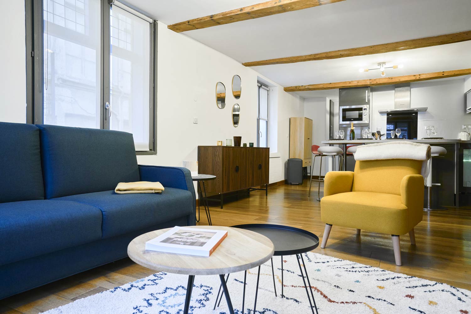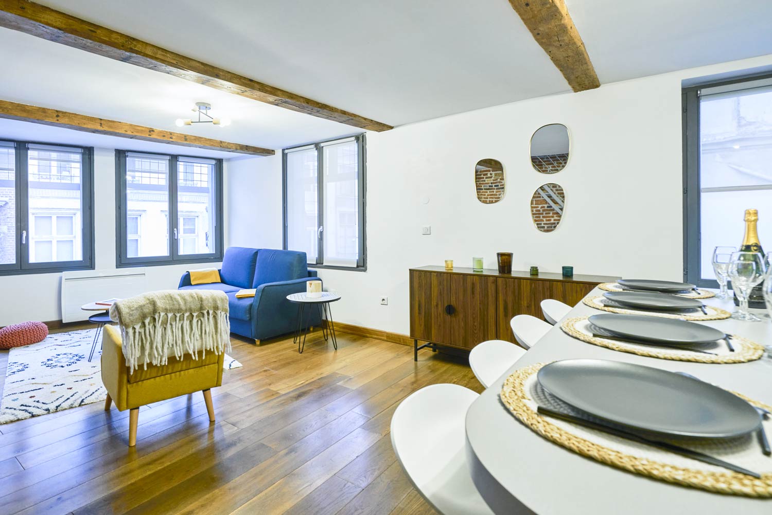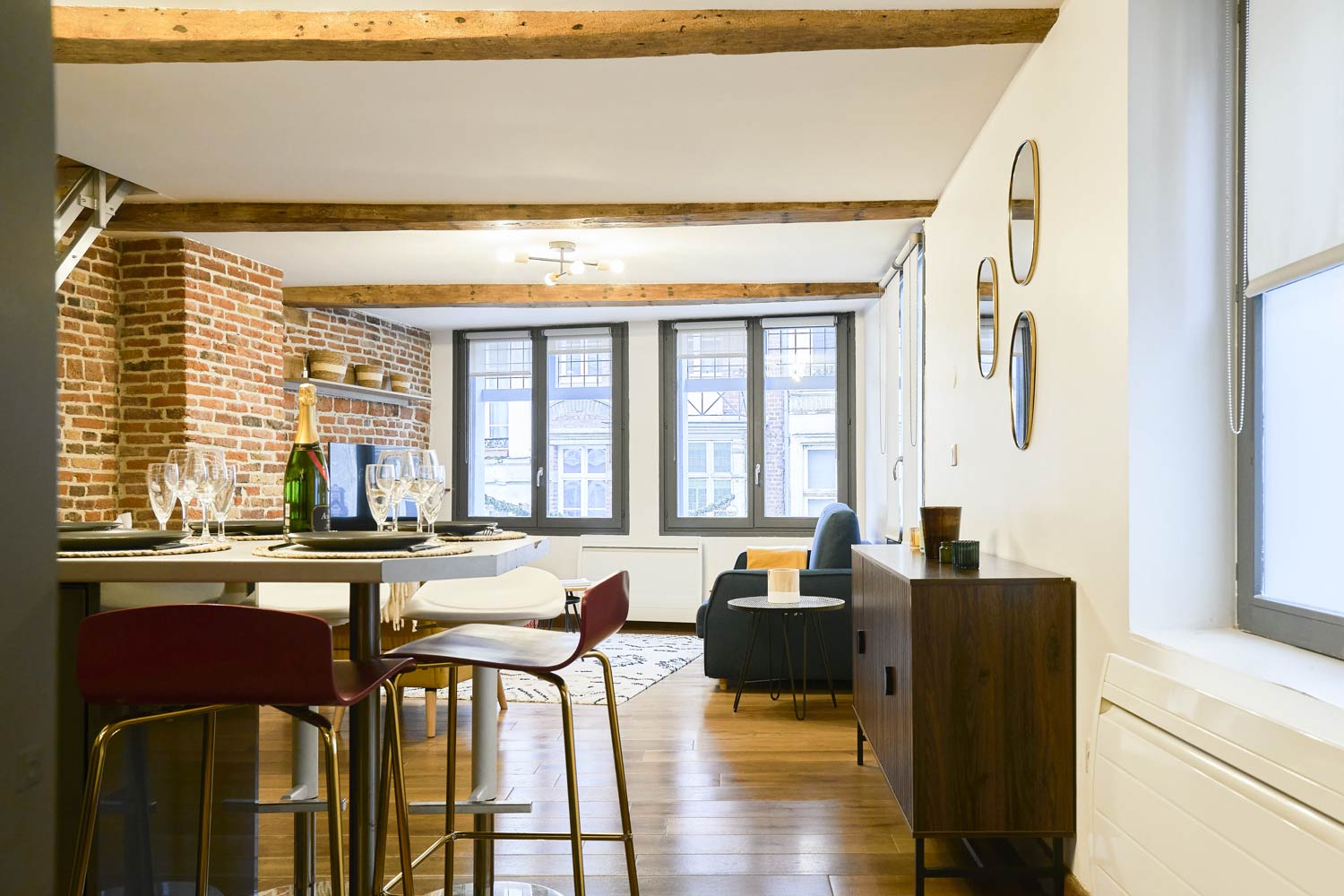 Le séjour se compose d’une grande salle au premier étage ouvert sur la cuisine et largement éclairé par trois fenêtres rehaussées de petits vitraux carrés translucides. Il propose un canapé convertible capable d’accueillir deux personnes et un large espace avec une superbe vue sur la rue Royale, une des rues les plus charmantes et dynamiques du Vieux-Lille.