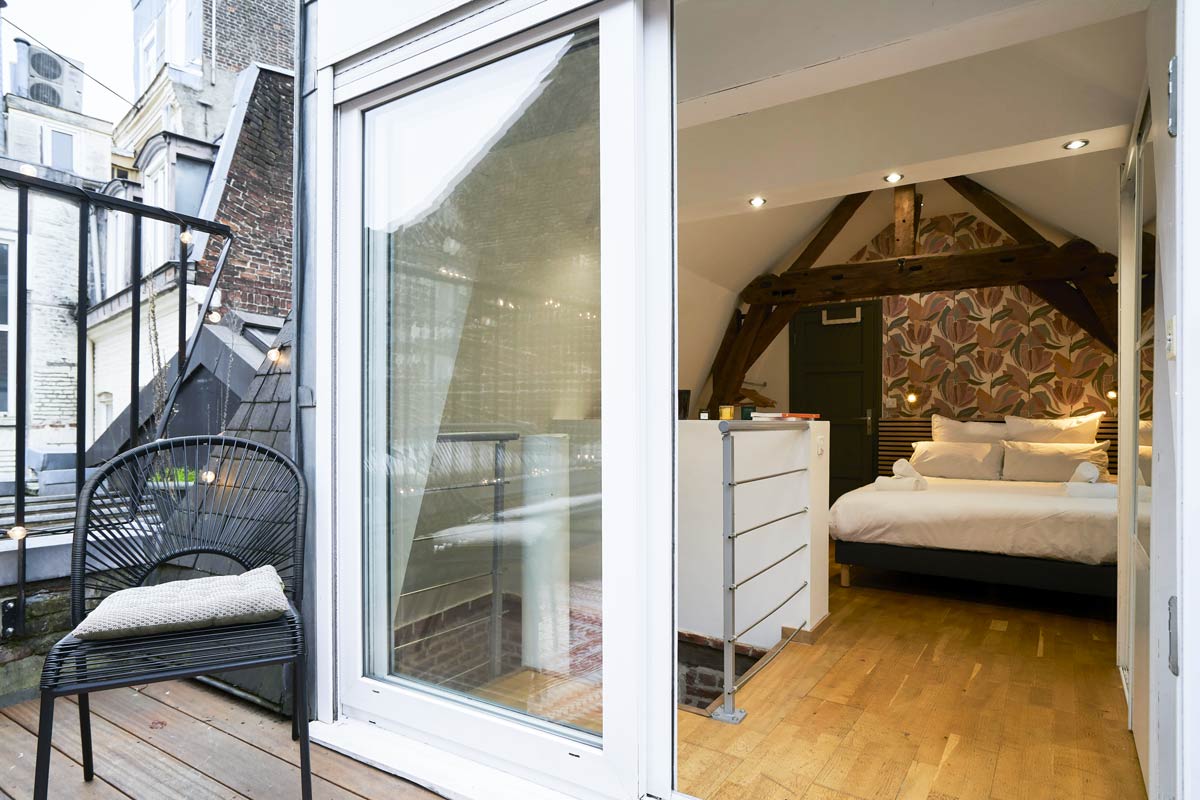 Située sous les toits, la chambre de la suite royale offre un espace large et confortable. La chambre est équipée d’un lit King Size d’un dressing et d’un écran géant. Cet espace de charme vous séduira avec sa hauteur sous plafond et sa charpente historique apparente typique des immeubles et des appartements du Vieux-Lille. Avec son convertible l’appartement peut accueillir jusqu’à 6 personnes. La chambre est très lumineuse et offre également un accès direct à la terrasse.
